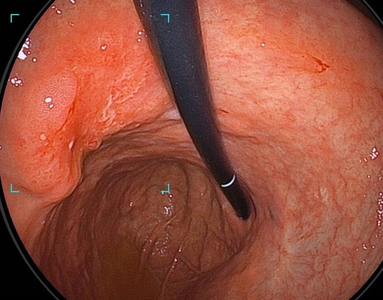 広い胃のなかでは反転し観察も行います。Scopeが写りこんでいても、確実に病変を捕捉していきます。