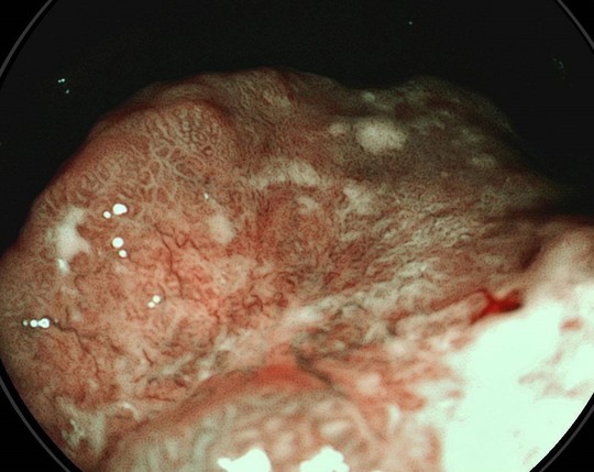 病変の内部構造を確認します。粘膜表層の血管構造をとらえ、腫瘍・非腫瘍の鑑別を行います