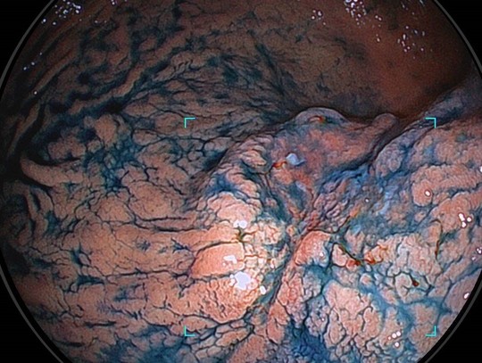 AIも利用しますが、一番大切なのは経験豊富な内視鏡専門医がしっかり診断することです。胃癌の診断では病変の範囲や深達度を評価するためにインジゴカルミンなど色素の散布を行ってより細かな診断をしていきます。
